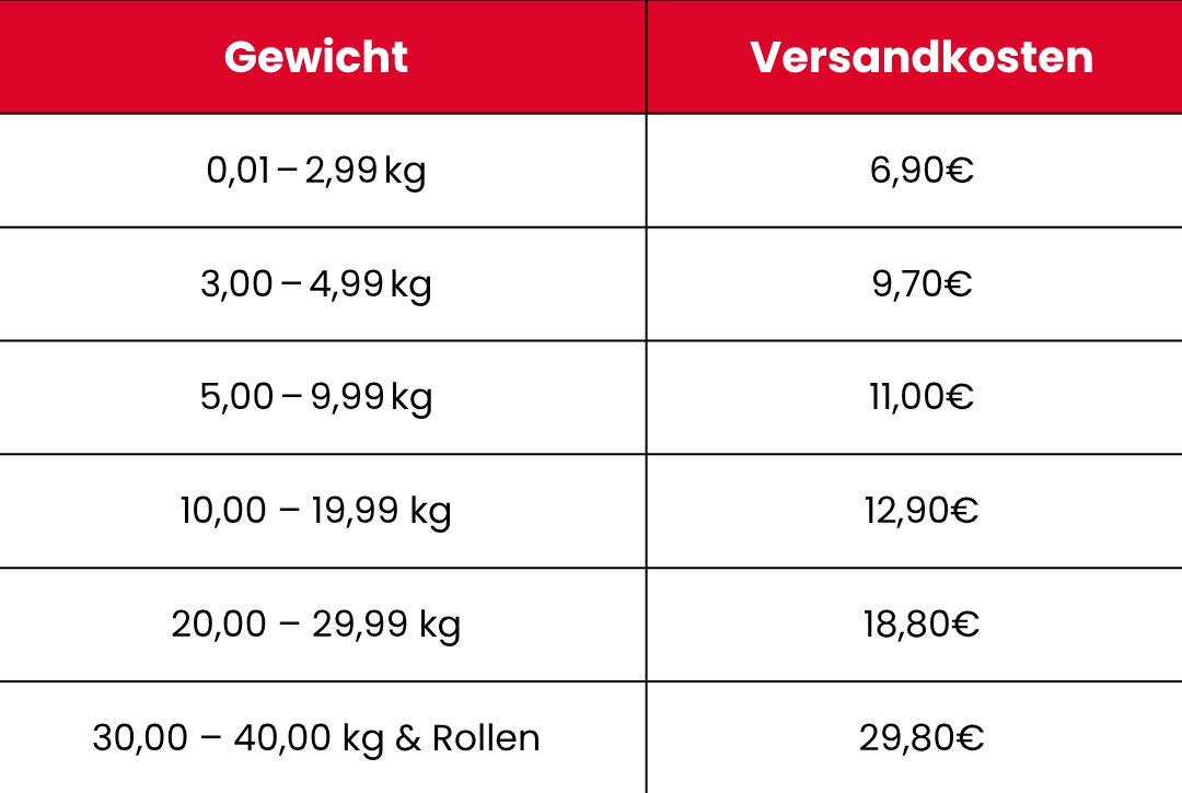 Die Versandkosten richten sich nach dem Gesamtgewicht Ihrer Bestellung (inklusive Verpackung ca. 1kg) und staffeln sich folgendermaßen.